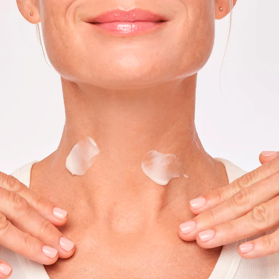 Aplica 1-2 pulsaciones sobre el cuello y el escote, con movimientos ascendentes desde el pecho hacia la barbilla, por la mañana y por la noche.